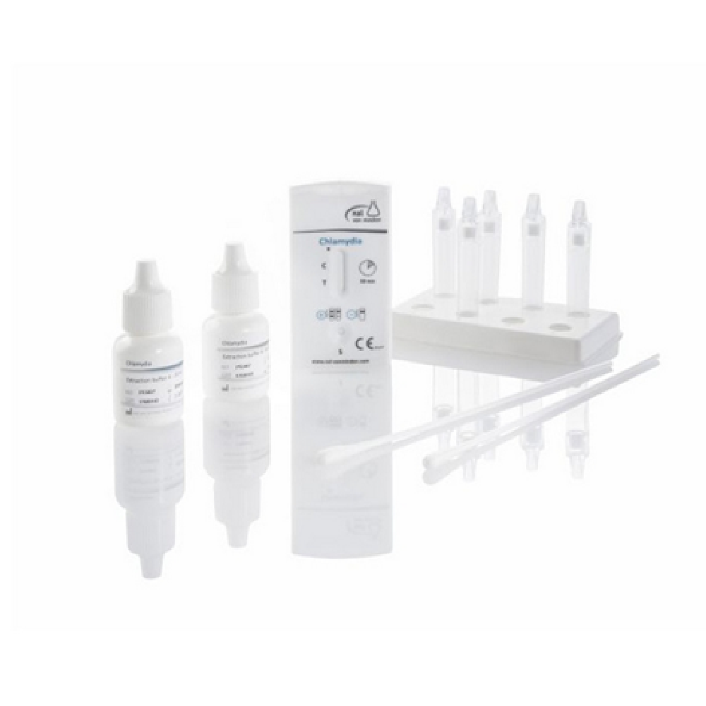 Test NADAL® Chlamydia (hisopo/orina), inmunoensayo visual rápido para detección cualitativa de Chlamydia trachomatis en muestras cervicales, uretrales u orina. Uso profesional, resultado en 10 minutos, sensibilidad hasta 92,6% y especificidad 96%. Incluye casetes, hisopos, tubos y reactivos. Almacenaje a 2-30°C, marcado CE, solo un uso