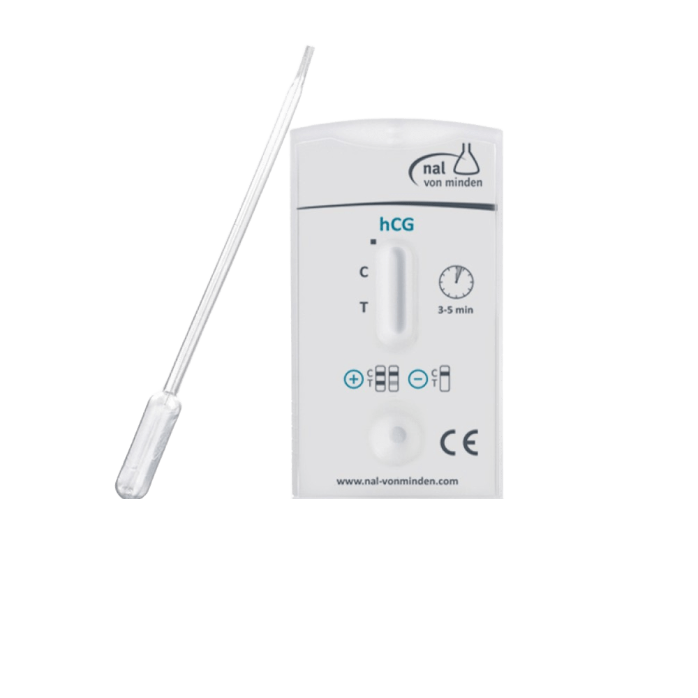 Test rápido de embarazo NADAL® hCG en formato tira, sensibilidad de 25 mIU/ml para detección cualitativa de hCG en orina. Resultados en 3-5 minutos, precisión y especificidad superiores al 99%, sin reacciones cruzadas con otras hormonas. Ideal para diagnóstico de embarazo desde 10-14 días tras la concepción. Caja de 50 tiras, fácil de usar, recomendado para clínicas y laboratorios profesionales