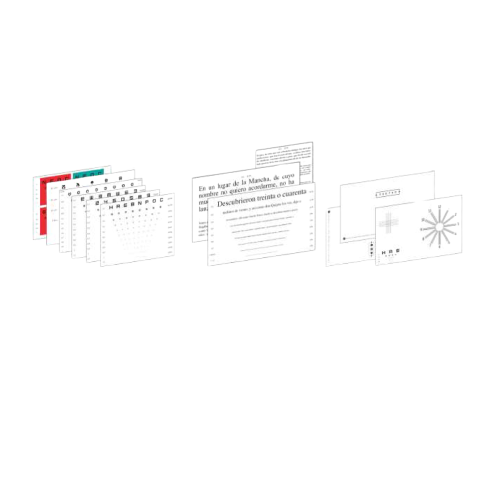 Test de Visión Próxima – Evaluación completa de la agudeza visual de cerca Incluye 12 láminas con optotipos, textos continuos y pruebas específicas de astigmatismo. Formato compacto, de alta calidad y fácil de utilizar en consulta.