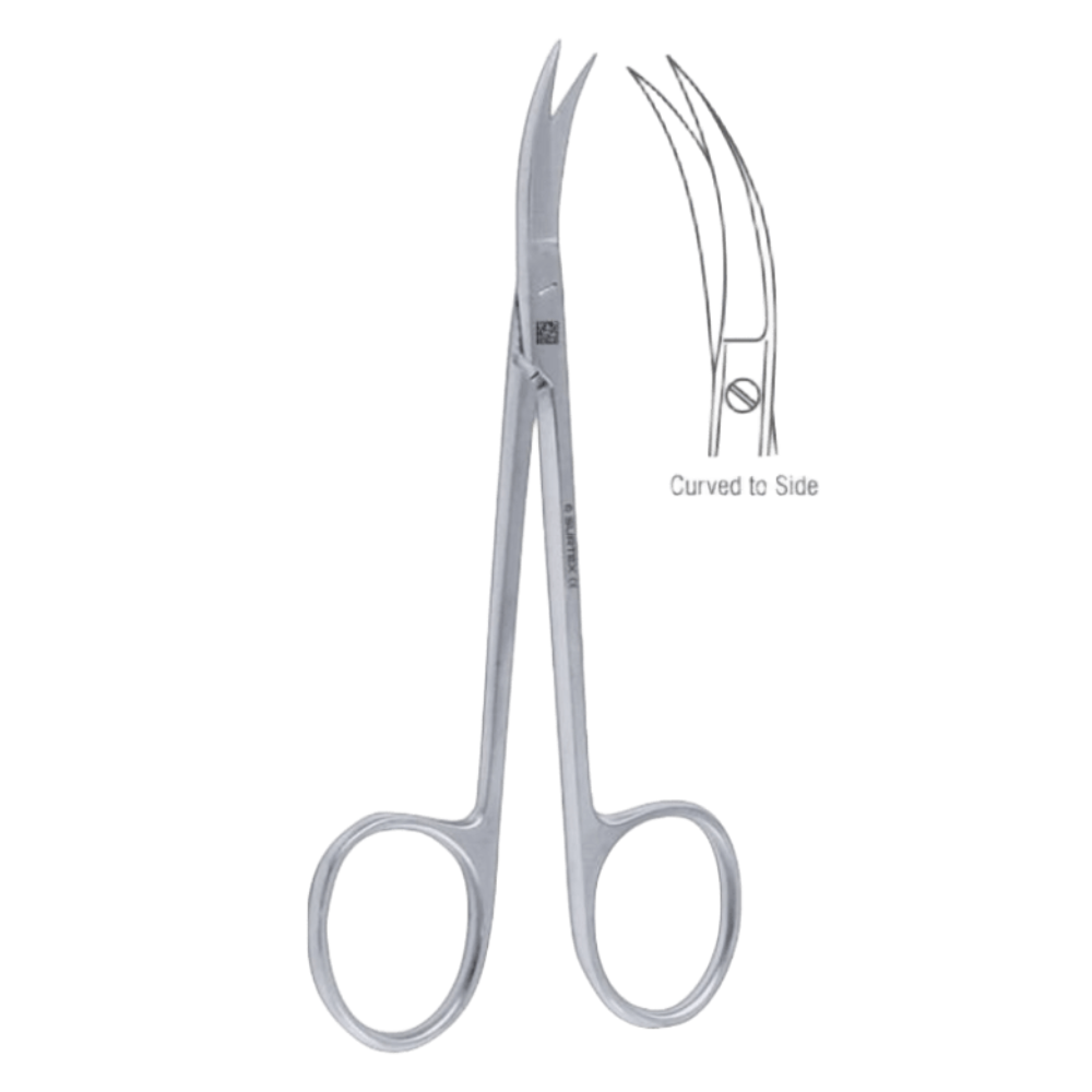 Tijera IRIS curva. Tijera Iris curva de 11 cm, diseñada para cortes precisos en tejidos delicados, ideal para microcirugías y procedimientos en áreas anatómicas reducidas