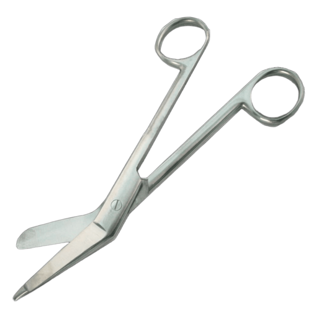 Tijera LISTER para vendajes. Tijera quirúrgica angulada con punta mixta, ideal para cortar vendajes, gasas o ropa sin dañar la piel del paciente. Disponible en 14 y 18 cm.