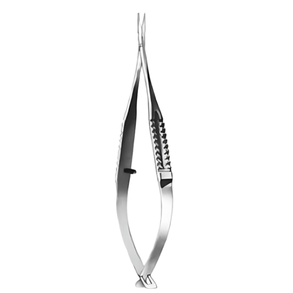 Tijera indectomia VANNAS. Tijera Vannas de 8 cm con punta afilada y ramas curvas, diseñada para cortes precisos en cirugía oftalmológica, especialmente capsulotomías.