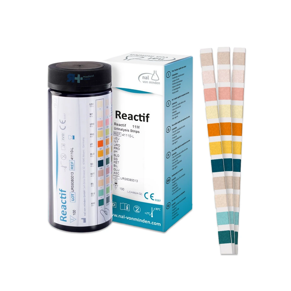 Tiras reactivas de orina Reactif 11M para detección cualitativa y semicuantitativa de 11 parámetros: ácido ascórbico, glucosa, bilirrubina, cetonas, gravedad específica, sangre, pH, proteínas, urobilinógeno, nitrito y leucocitos. Resultados en minutos, alta sensibilidad, fácil lectura visual o automática. Solo para uso profesional, caja de 25 unidades, recomendadas para diagnóstico y control en laboratorios y consultas