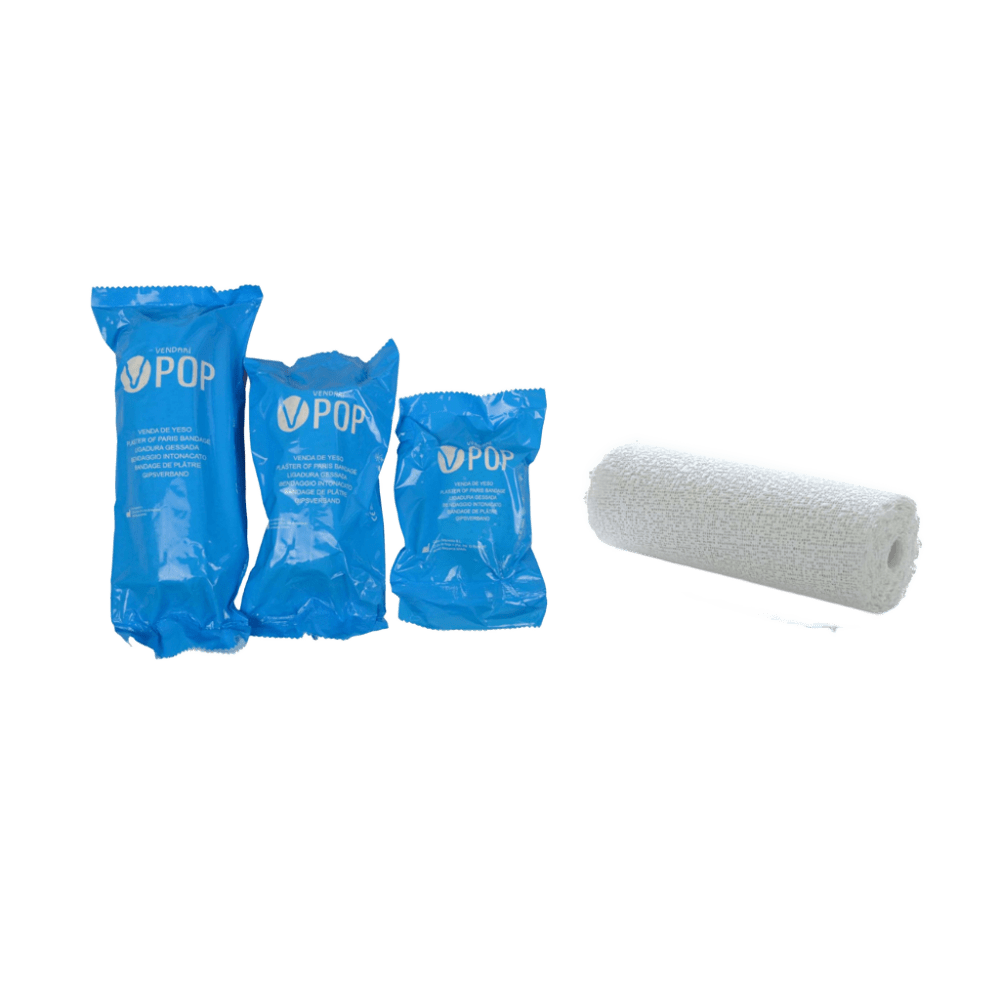 Venda de yeso compuesta por tejido de gasa entrelazada de 100 % algodón impregnado con sulfato de calcio, ideal para inmovilizaciones rápidas y eficaces.